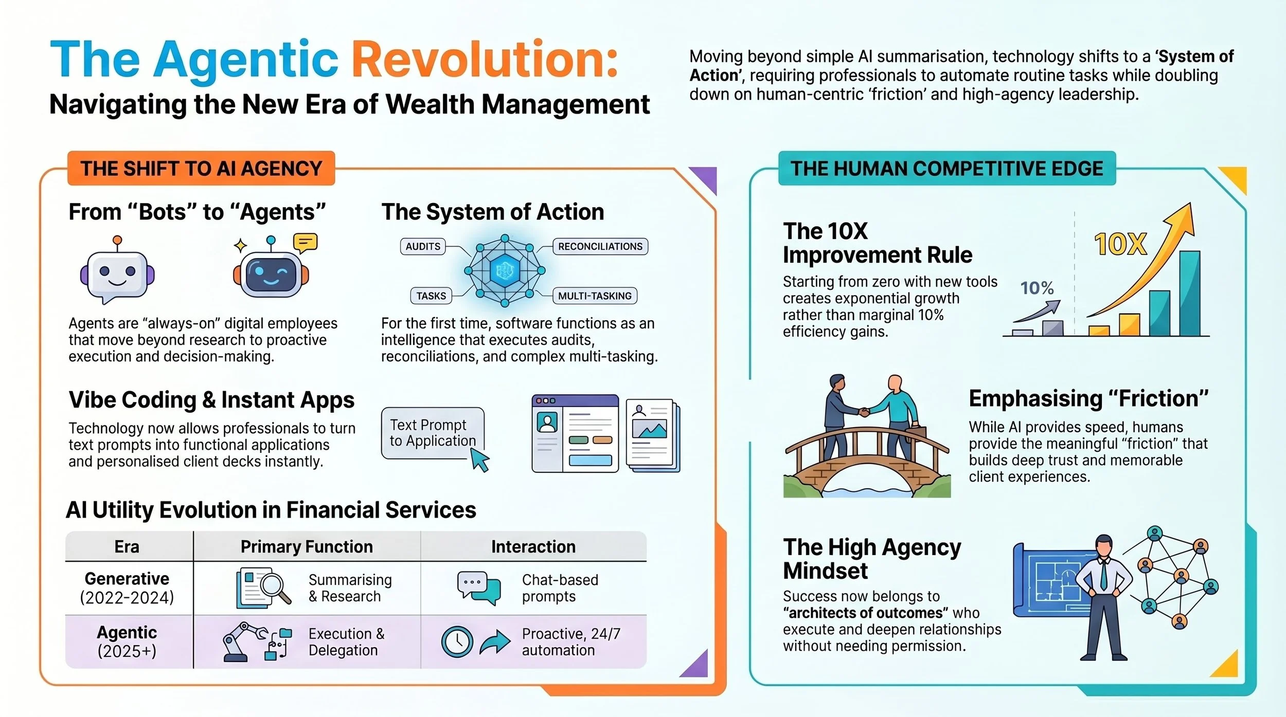 The most important year of a professional's career is the current one. Whether starting out or nearing retirement, the imperative is to build a skillset around agentic technology. The goal is not merely to use AI for efficiency but to leverage it to amplify human strengths, creating organizations that are either hyper-efficient or deeply human, but never mediocre.